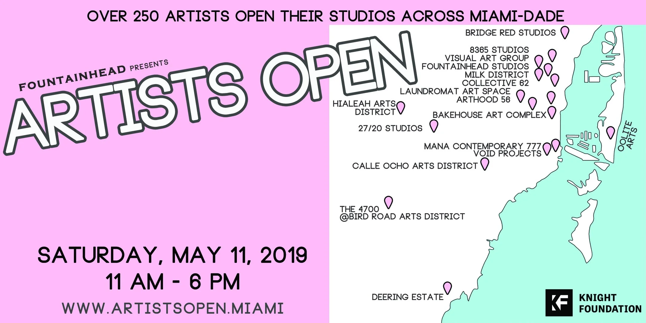 Complexes and communities, listed north to south, include; Bridge Red Art Complex, 8365 Studios, Fountainhead Studios, Visual Art Group, the Milk District, The Collective 62, Laundromat Art Space, ArtHood 56, Doral Art Studios, Hialeah Arts District, Bakehouse Art Complex, 27/20 Studios, Oolite Arts (Miami Beach), Mana Contemporary 777, Void Projects, Calle Ocho Arts District, 4700 @ Bird Road Arts District and Deering Estate. Dimensions Variable is hosting their grand opening and will be open 6-10pm ONLY.